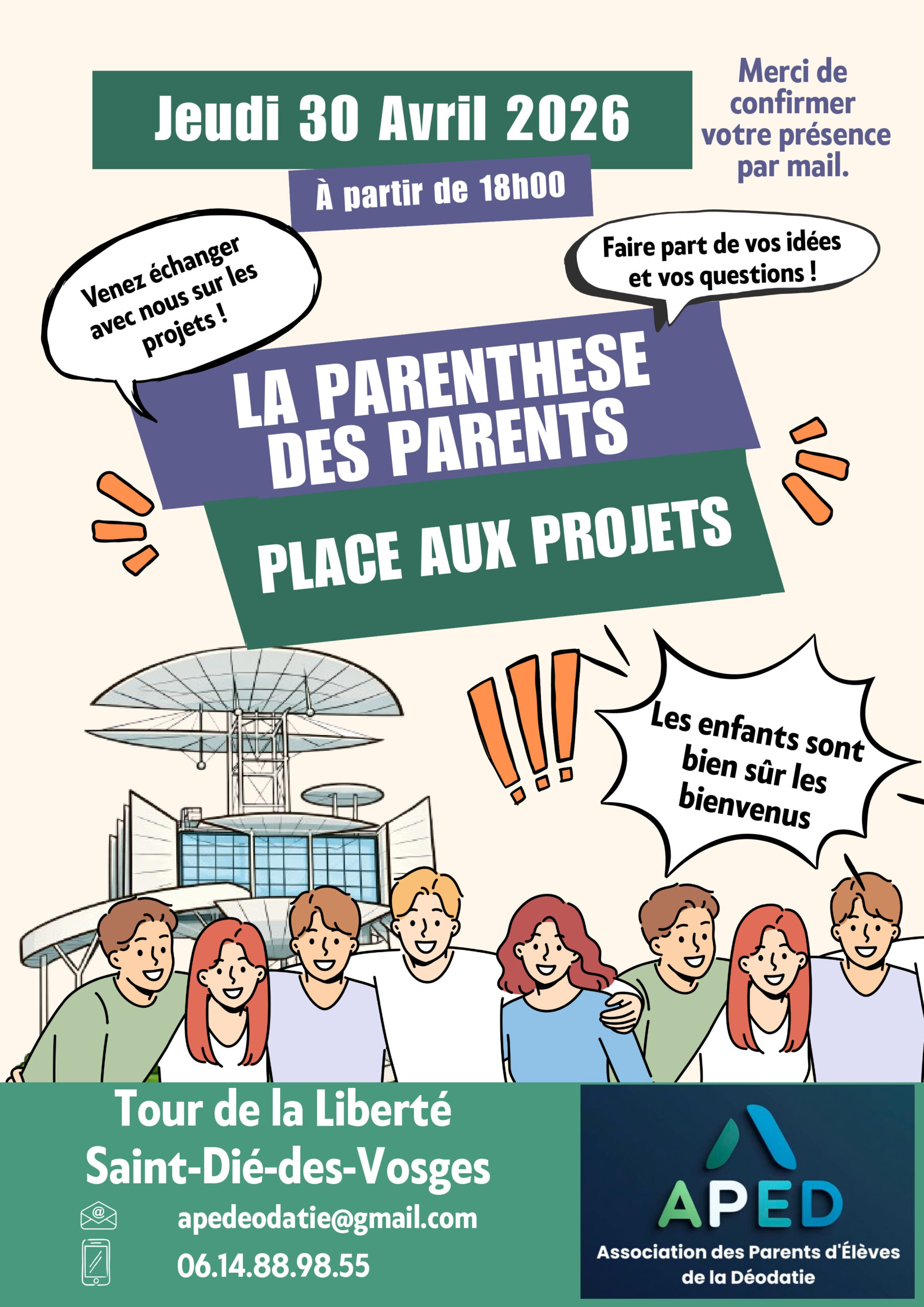 Le 30 avril 2026 à partir de 18h00 a lieu une réunion de l’Association des Parents d’Elèves de la Déodatie (APED) à la tour de la liberté.